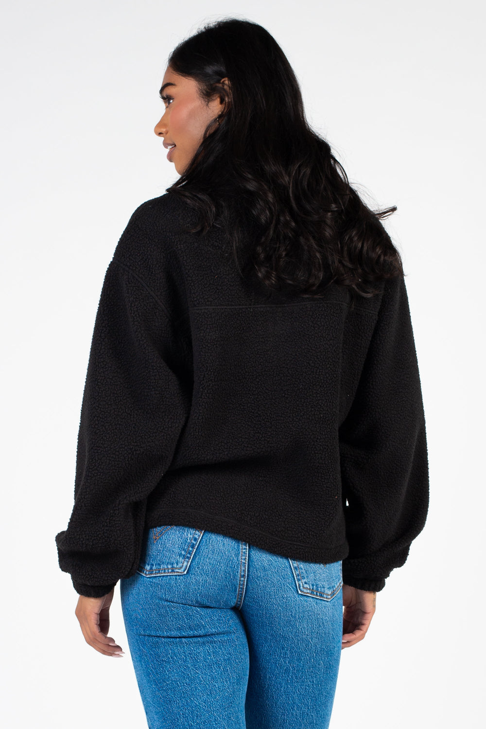 This cozy fleece top is perfect for a laid-back yet stylish look! With its pointed collar, half zip closure, dropped shoulder seams, and elastic banding at the cuffs, it's sure to keep you comfy and looking cute. Side seam drop in pockets make for an ideal and functional fit. This piece will quickly become a cozy day favourite!