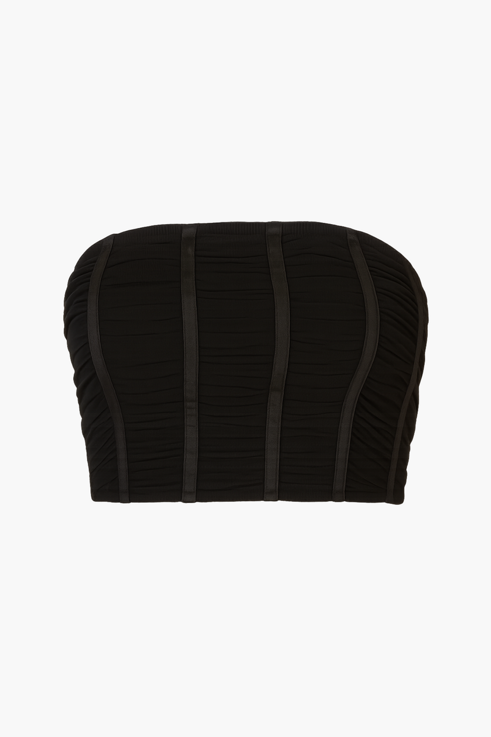 Flirty, fitted, and ready to turn heads. The Bailee Ruched Mesh Crop Blouse is your new go-to for going out. This strapless, bustier-inspired style features soft ruching throughout, sculpting the body with a romantic, airy texture. The cropped length and structured fit make it perfect for pairing with high-waisted skirts or tailored trousers for an effortlessly dressy look.
