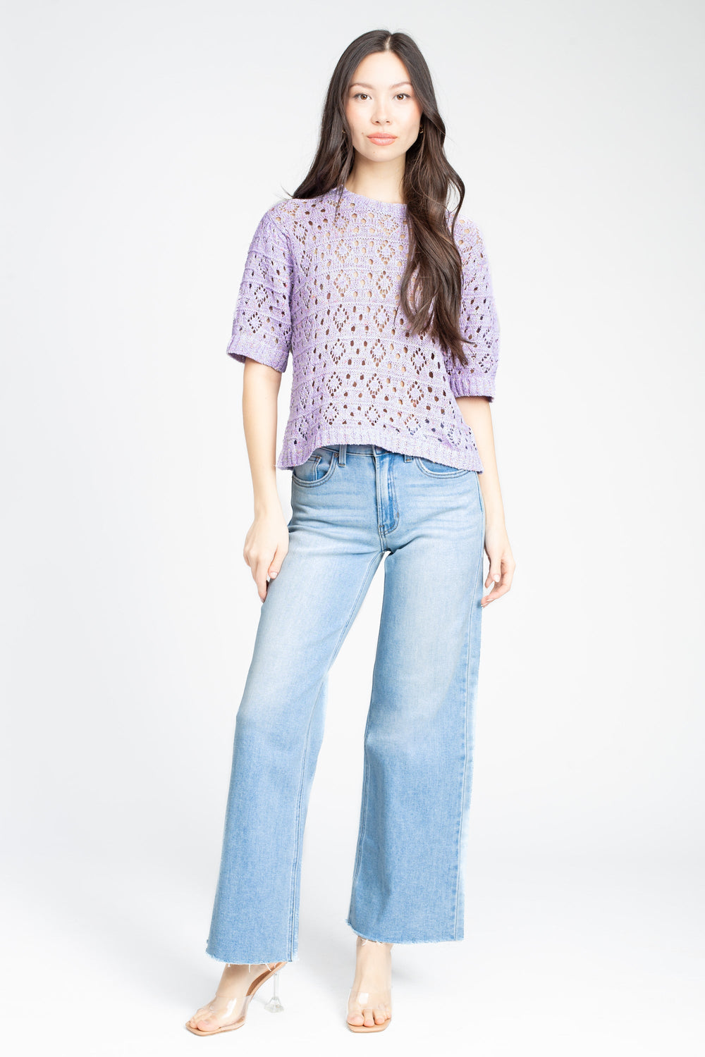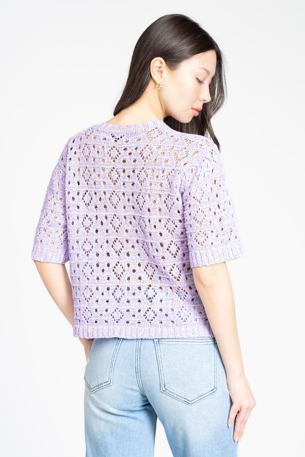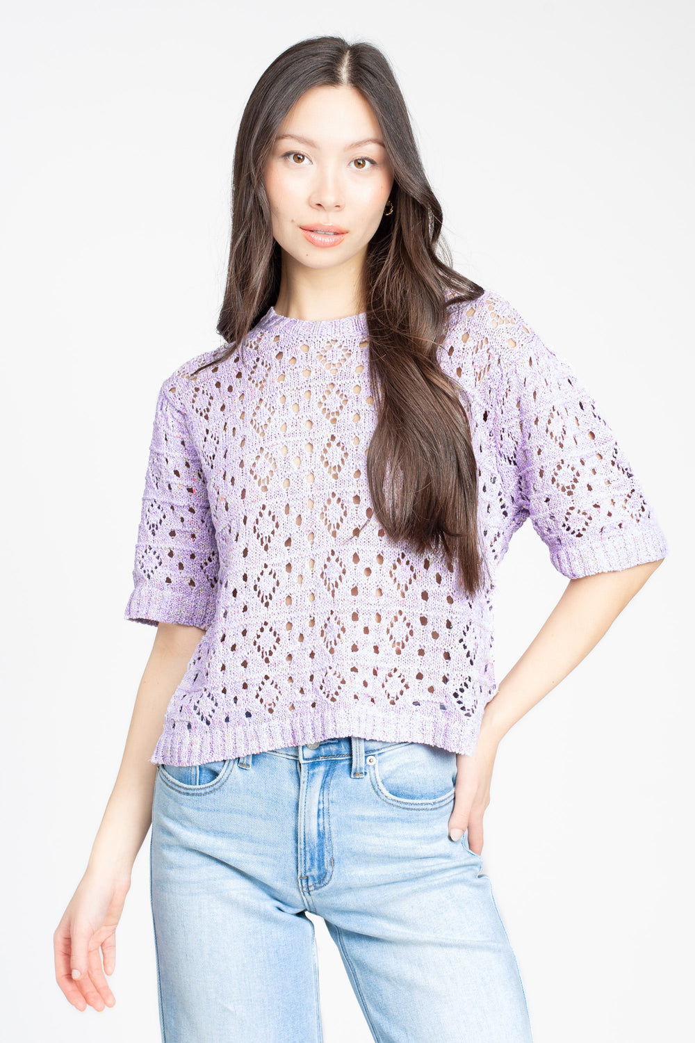 Bring a pop of color and texture to your wardrobe with the John + Jenn Saint Sweater. Featuring a beautiful open-knit design, this top offers a breathable and lightweight feel, perfect for layering or wearing solo. The relaxed fit and ribbed detailing on the cuffs and hem add a chic, casual touch, while the soft lavender hue brings a fresh, feminine vibe.