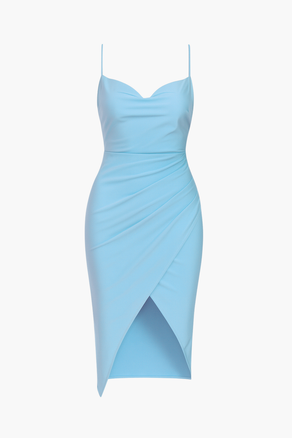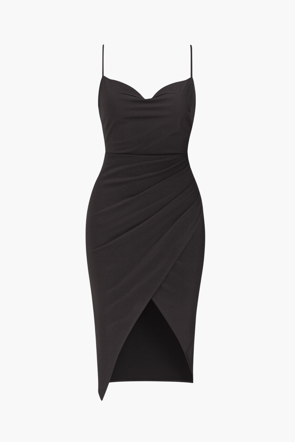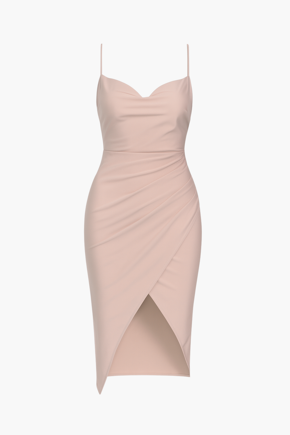 Make any event a stunning one when you waltz into the room in the Elle Satin Ruched Tulip Midi Dress! This sleek stretch-woven satin forms into a bodycon silhouette with ruched detailing along the side seam. A stunning cowl neck is framed by spaghetti straps that fall into a criss-cross pattern framing the open back. Complete with a midi length hem and wrap over slit.