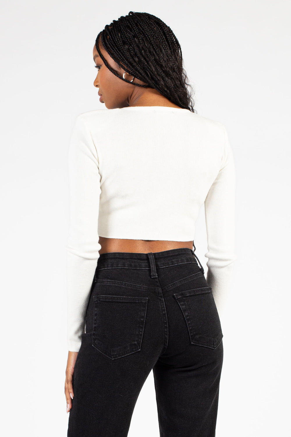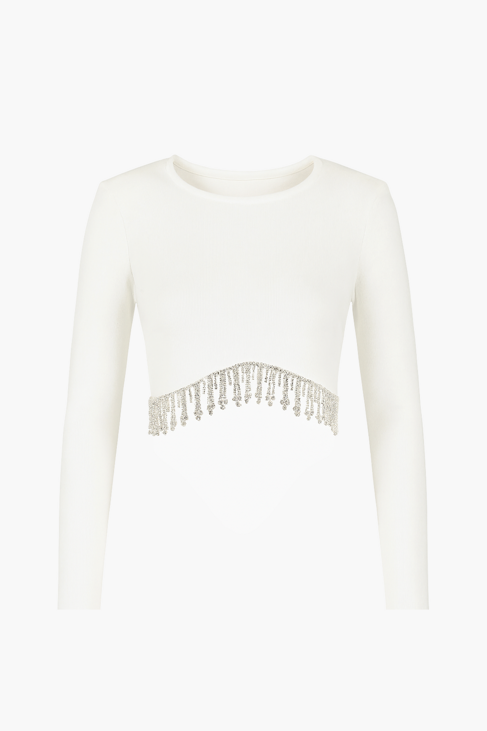 Bring on the glitz and the glam with this elevated crop top. The Stasia Rhinestone Fringe Crop Sweater features a bodycon silhouette, fitted long sleeves, a ribbed neckline and a shimmering rhinestone fringe. The perfect touch for taking a basic outfit to the next level.